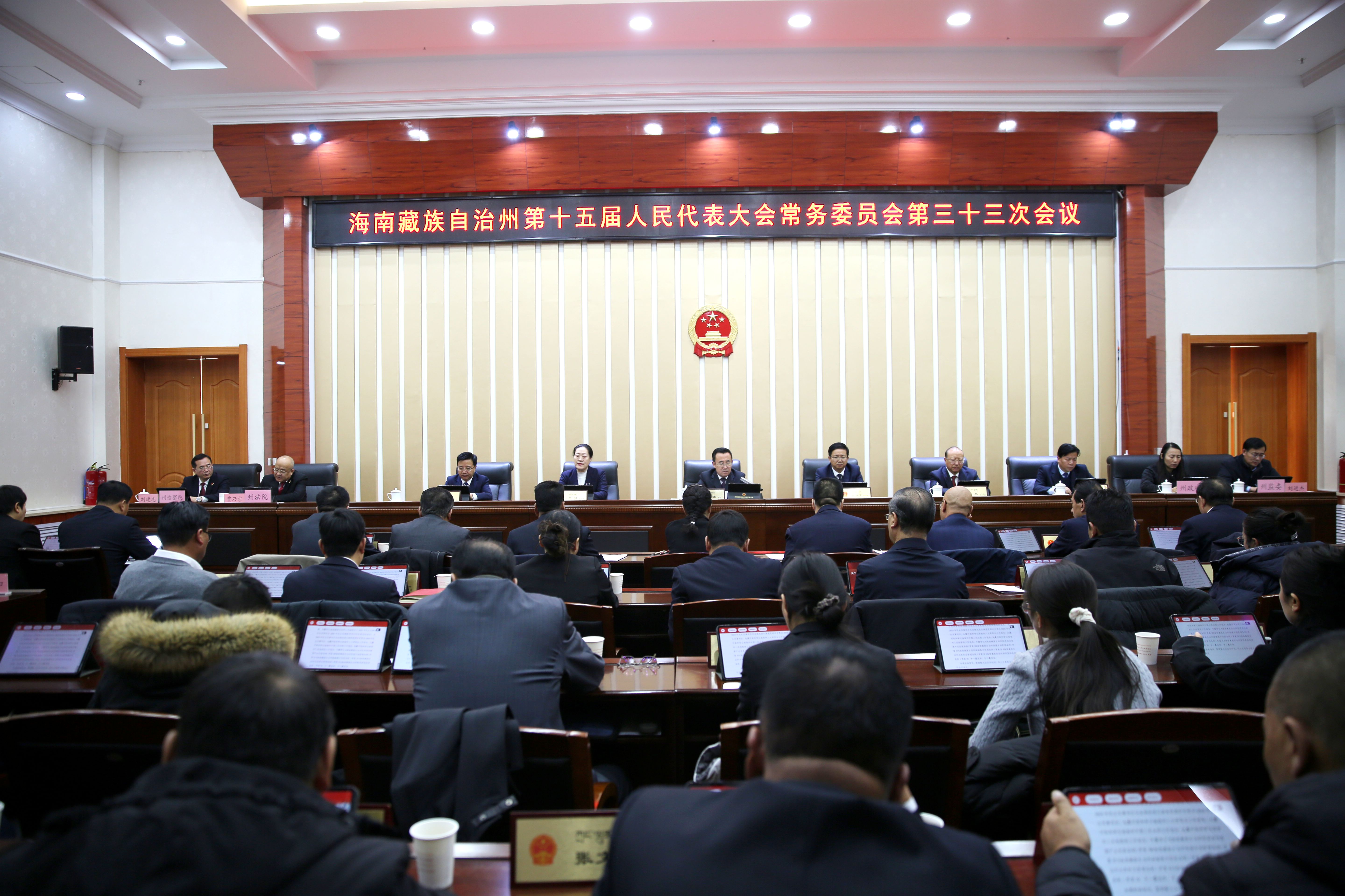 12月23日至24日,海南州第十五届人大常委会第三十三次会议在州会议中心召开,州人大常委会党组书记、主任马建宏主持会议,副主任樊润元、三措、华旦、耿生成,秘书长快欠端智及委员共34人出席会议。