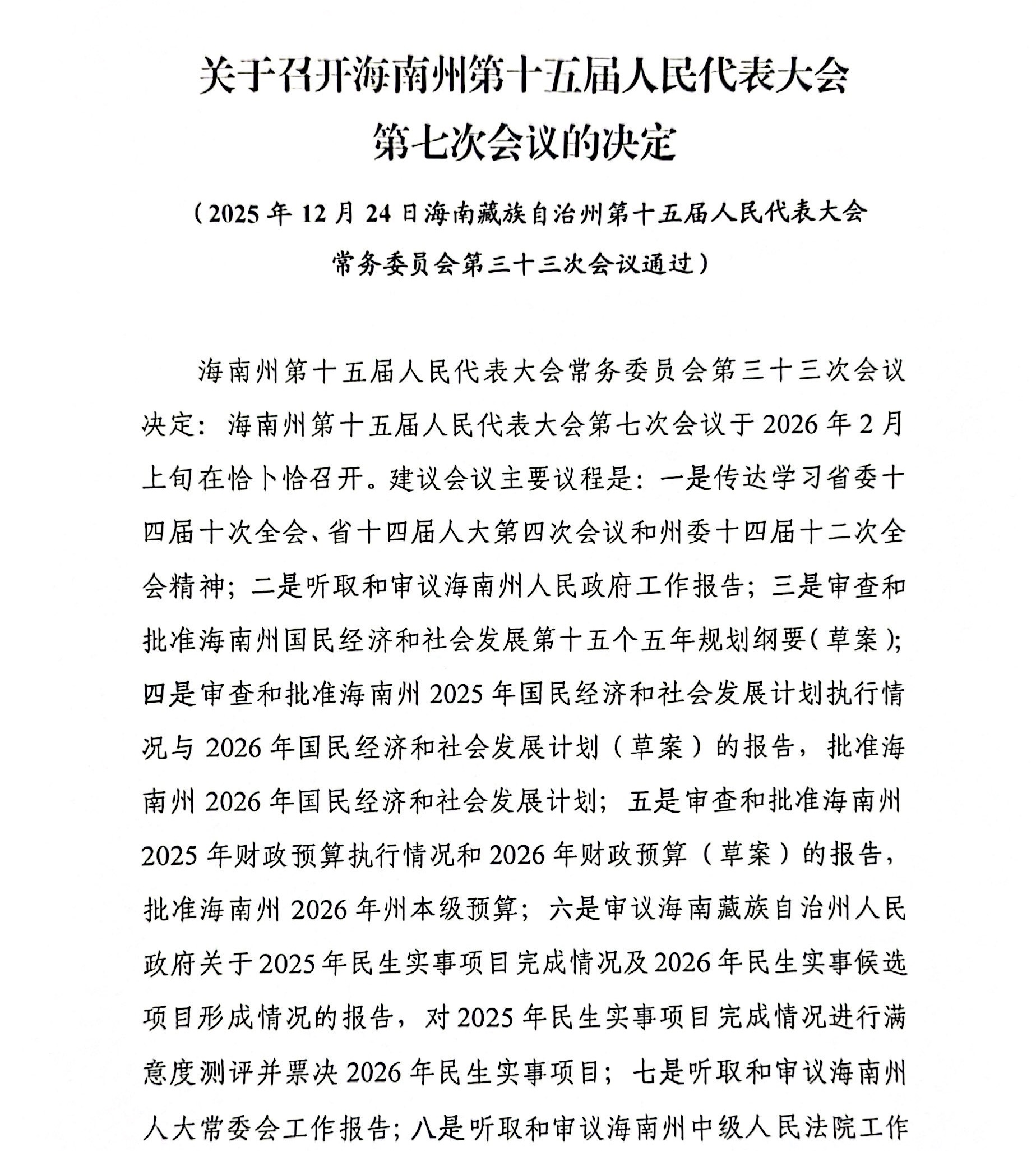 关于召开海南州第十五届人民代表大会第七次会议的决定