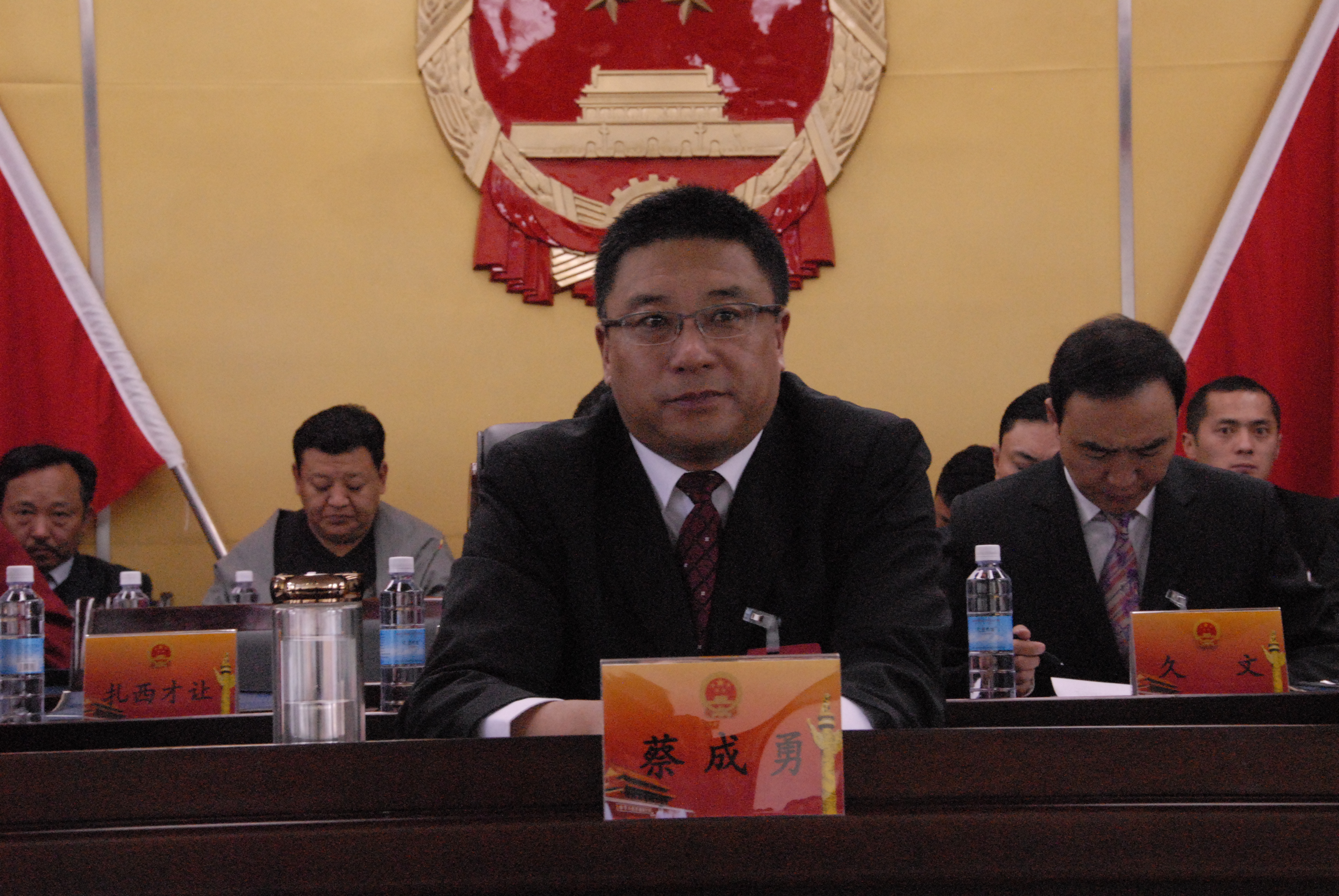 大会执行主席蔡成勇、马成洪、刘中、汤有然、才仁达哇、石兆英、松杰在主席台前排就座。